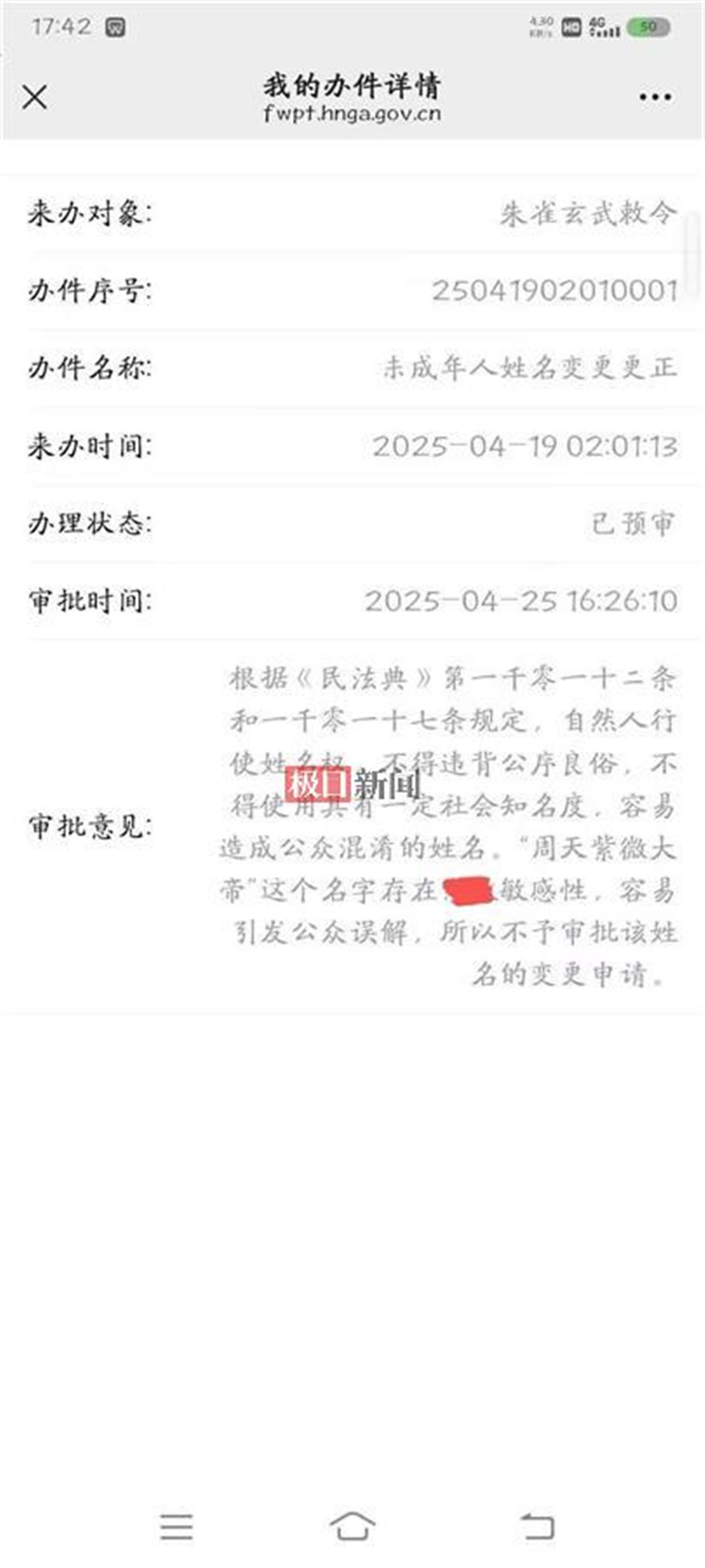 4月25日极目新闻曾经报道,这位现在真名就叫“朱雀玄武敕令”的湖南24岁小伙,出生时的名字为朱云飞,从2024年5月开始,已经先后改名为“朱雀玄武”“朱雀玄武敕令”。今年4月16日,“朱雀玄武敕令”登录湖南政务服务网申请改名为“周天紫薇大帝”,申请未予以通过。