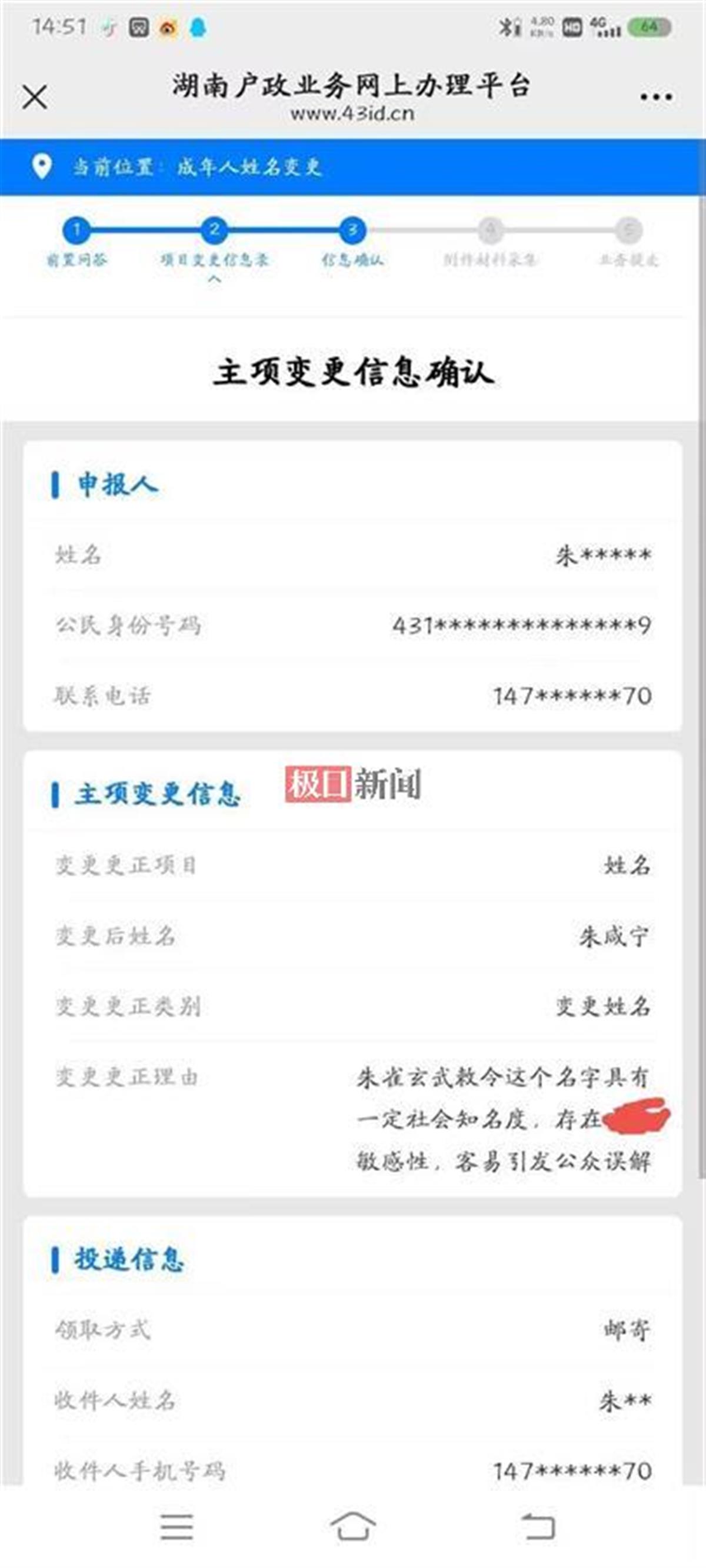 4月26日下午3时许,“朱雀玄武敕令”向极目新闻记者提供了他再次向湖南政务服务网申请改名的截图。信息显示,申请变更后的姓名为“朱咸宁”,申请变更的理由为:“朱雀玄武敕令这个名字具有一定的社会知名度,存在敏感性,容易引发公众误解。”